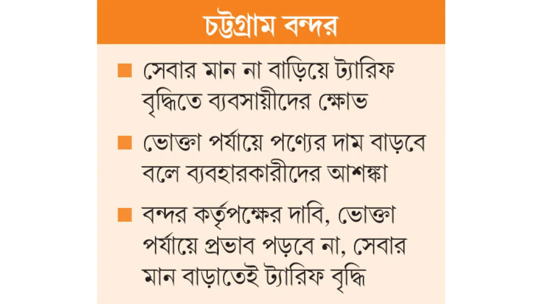 যথারীতি চট্টগ্রাম বন্দরের ট্যারিফ বাড়ানো হলো। ব্যবহারকারীদের বিরোধিতা সত্ত্বেও বন্দরে জাহাজ ভেড়ানো থেকে শুরু করে কনটেইনার ওঠানো ও নামানোসহ সব সেবার বিপরীতে ৩০ থেকে ৫০ শতাংশ পর্যন্ত ট্যারিফ বেড়েছে। ৩৯ বছর পর এই ট্যারিফ বাড়ানো হলেও ব্যবসায়ীরা আশঙ্কা করছেন, এতে ভোক্তা পর্যায়ে পণ্যের দাম বেড়ে যাবে। গতকাল সোমবার থেকে এ ট্যারিফ কার্যকর হওয়ার কথা থাকলেও সরকারের পক্ষ থেকে গেজেট প্রকাশের পর বন্দর ব্যবহারকারীদের মধ্যে অসন্তোষ দেখা দিয়েছে। তাদের অভিযোগ, উন্নত বন্দরের আদলে চার্জ আদায় করা হলেও, সেবার মান রয়েছে সনাতন বন্দরের মতো।