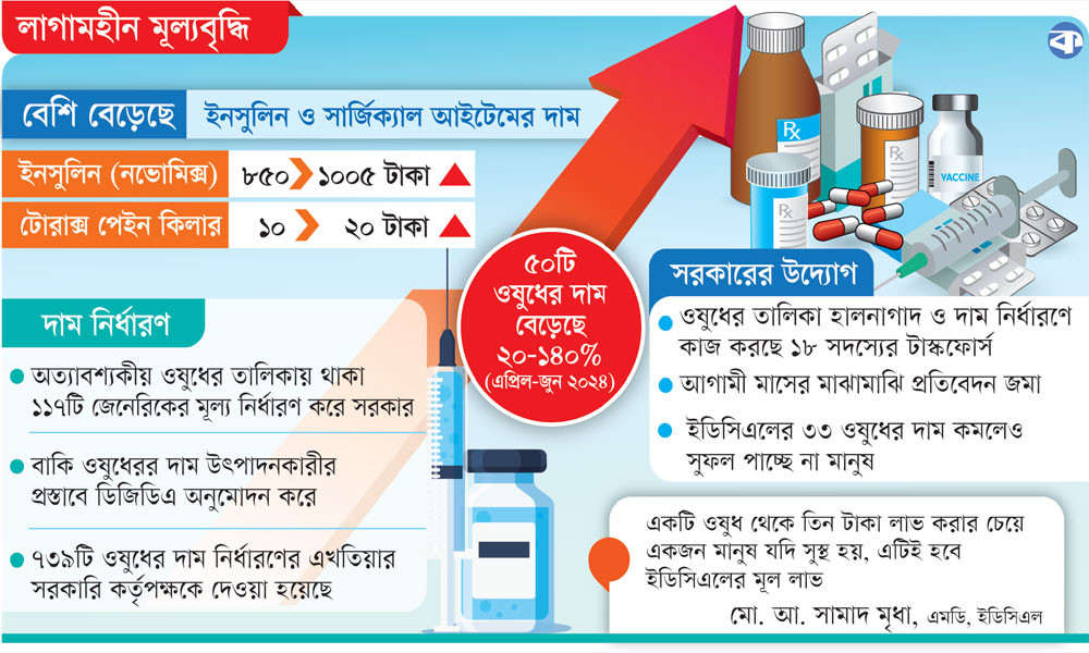 কোন ওষুধের দাম কত বাড়ল? : ২০২৪ সালের এপ্রিল থেকে জুনের মধ্যে অন্তত ৫০টি প্রয়োজনীয় ওষুধের দাম ২০ থেকে ১৪০ শতাংশ পর্যন্ত বেড়েছে বলে হাইকোর্টে জমা দেওয়া এক প্রতিবেদনে উল্লেখ করা হয়েছে। এ নিয়ে হাইকোর্ট সরকারকে ব্যবস্থা নিতে নির্দেশ দিলেও বাজারে তেমন কোনো পরিবর্তন দেখা যায়নি।রাজধানীর বিভিন্ন এলাকার ফার্মেসি ঘুরে এবং ক্রেতা-বিক্রেতাদের সঙ্গে কথা বলে ওষুধের মূল্যবৃদ্ধির তথ্য পাওয়া গেছে। দেশে সর্দি-কাশি, গ্যাস্ট্রিক, উচ্চ রক্তচাপ, ডায়াবেটিস, হৃদরোগ এবং অ্যান্টিবায়োটিকসহ প্রায় সব ধরনের ওষুধের দাম ২০ থেকে ক্ষেত্রবিশেষে ৫০ শতাংশেরও বেশি বেড়েছে। গ্যাস্ট্রিকের অতি পরিচিত একটি ট্যাবলেটের প্রতি পাতার দাম ৭০ টাকা থেকে বেড়ে ১০০ টাকা হয়েছে। উচ্চ রক্তচাপের ওষুধের দাম প্রতি পাতায় ২০ থেকে ৩০ টাকা বেড়েছে। ব্যথার ওষুধ টোরাক্সের দাম ১০ টাকা থেকে বেড়ে ২০ টাকা হয়েছে। মিক্সটার্ড, নভোমিক্স ৩০ ইনসুলিন ইনজেকশনের দাম ৪৬০ টাকা থেকে বেড়ে ৫১০ টাকা এবং নভোমিক্স ফ্লিক্সপেন ৮৫০ টাকা থেকে বেড়ে ১০০৫ টাকা হয়েছে। রাজধানীর লাজফার্মা, লিড ফার্মা, আল শেফা ফার্মাতে বাড়তি দামে ওষুধ বিক্রি হচ্ছে। রাজধানীর বাইরের চিত্রও একই। কালের কণ্ঠের প্রতিনিধি জানিয়েছেন, নোয়াখালী জেলা শহরের ফার্মেসিগুলোর দেওয়া তথ্যে দেখা গেছে, অ্যান্টিবায়োটিক এজিথ্রোমাইসিন ৫০০ এমজি ৩৫ টাকা থেকে ৪০ টাকা এবং সেফ থ্রি সেফ্রিক্সিম ২০০ এমজি ৩৫ টাকা থেকে বেড়ে ৪৫ টাকা হয়েছে। ওআরএস বা খাবার স্যালাইনের মতো নিত্যপ্রয়োজনীয় ওষুধের দামও বেড়েছে। এসএমসির ওরাল স্যালাইন পাঁচ টাকা থেকে বেড়ে ছয় টাকা হয়েছে। গাজীপুর শহরের হাড়িনাল এলাকার বাসিন্দা অবসরপ্রাপ্ত শিক্ষিকা নীলিমা আক্তার উচ্চ রক্তচাপ, হার্ট ও ডায়াবেটিসে আক্রান্ত। এক বছর আগেও তাঁর প্রতি মাসে এসব রোগের ওষুধ কিনতে খরচ হতো পাঁচ হাজার টাকার মতো। ওই ওষুধ এখন কিনতে হচ্ছে সাড়ে ছয় হাজার টাকা দিয়ে।