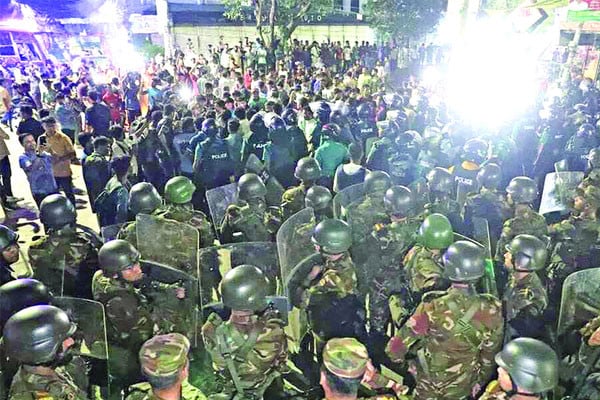 এদিকে গতকাল মধ্যরাতে আন্তবাহিনী জনসংযোগ পরিদপ্তরের (আইএসপিআর) সংবাদ বিজ্ঞপ্তিতে জানানো হয়, প্রথমে পুলিশ ঘটনাস্থলে উপস্থিত হয়ে পরিস্থিতি নিয়ন্ত্রণের চেষ্টা করে। তবে একপর্যায়ে সংঘর্ষ বেড়ে গেলে তারা সেনাবাহিনীর সহযোগিতা কামনা করে। বারবার অনুরোধ সত্ত্বেও কতিপয় নেতা-কর্মী তা উপেক্ষা করে মব ভায়োলেন্সের মাধ্যমে পরিস্থিতি অশান্ত করার চেষ্টা করে। জননিরাপত্তা রক্ষায় আইনশৃঙ্খলা রক্ষাকারী বাহিনী বলপ্রয়োগে বাধ্য হয়। এ ঘটনায় সেনাবাহিনীর পাঁচ সদস্য আহত হন বলে বিজ্ঞপ্তিতে জানানো হয়।