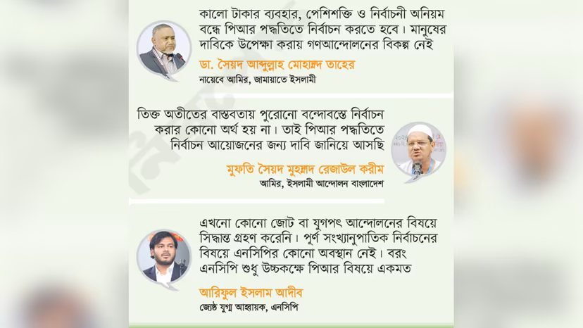পিআরসহ ৫ দফা দাবিতে একই সময়ে ইসলামী আন্দোলন বাংলাদেশের নতুন কর্মসূচি ঘোষণা দিয়েছে। গতকাল ইসলামী আন্দোলন বাংলাদেশের আমির মুফতি সৈয়দ মুহম্মাদ রেজাউল করীম এ কর্মসূচি ঘোষণা করেন। এসময় তিনি বলেন, জুলাইতে ছাত্র-জনতা রক্ত দিয়েছে দেশকে স্থায়ীভাবে স্বৈরতন্ত্রের কবল থেকে রক্ষা করা, রাষ্ট্রের পরতে পরতে জমা হওয়া ৫৪ বছরের জঞ্জাল দূর করা, ক্ষমতার ভারসাম্য আনা, সর্বত্র জবাবদিহিতা নিশ্চিত করা, সাংবিধানিক প্রতিষ্ঠানগুলোকে সক্রিয় ও স্বাধীন করার জন্য মৌলিক সংস্কার করার জন্য এবং দেশের রাজনৈতিক সংস্কৃতির শুদ্ধতা আনা ও সব নাগরিকের ভোটের অধিকার, সম্মান-মর্যাদা নিশ্চিত করার জন্য। অতএব জুলাই পববর্তী বাংলাদেশে ‘সংস্কার-বিচার ও নির্বাচন’ এই ক্রমধারা অনুসরণ করা রক্তের দায় ও অঙ্গীকার। কিন্তু অতীব দুঃখের সঙ্গে বলতে হচ্ছে, সংস্কার ও বিচারকে গুরুত্ব না দিয়ে নির্বাচনকে মুখ্য করে তোলা হয়েছে, যা দেশকে পুরোনো অশুভ বন্দোবস্তে আবারও নিপতিত করবে বলে আমরা আশঙ্কা করি।