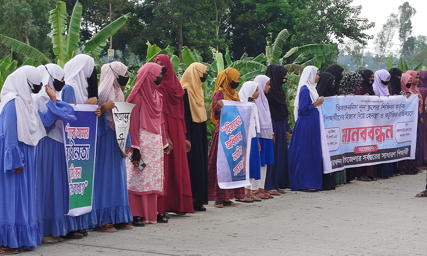 রাজধানীর ভিকারুননিসা নূন স্কুল অ্যান্ড কলেজে হিজাব পরায় ক্লাস থেকে শিক্ষার্থীকে বের করে দেয়ার প্রতিবাদে সিরাজগঞ্জের কামরখন্দে মানববন্ধন করা হয়েছে। কামারখন্দ উপজেলা ইসলামী ছাত্রী সংস্থার উদ্যোগে বুধবার দুপুরের দিকে একই এলাকার কোনাবাড়ী কলেজ মোড় ফ্লাইওভারে নিচে এ মানববন্ধন অনুষ্ঠিত হয়। এতে বক্তব্য রাখেন, ওই সংস্থারর সভাপতি নাসরিন সারমিন, সেক্রেটারি সাদিয়া আফরিন ও সাধারণ শিক্ষার্থীরা। বক্তারা বলেন, নারীদের জন্য হিজাব পরা ফরজ। হিজাব মুসলিম নারীদের মর্যাদা ও গর্বের প্রতীক। ৯৫ ভাগ মুসলমানের দেশে একজন শিক্ষক হিজাব পড়ার কারণে ওই স্কুলের ২২ শিক্ষার্থীকে শ্রেণিকক্ষ থেকে বের করে দেন। এ ঘটনার তীব্র নিন্দা ও প্রতিবাদ জানাচ্ছি এবং ওই শিক্ষিকাকে ক্ষমা চাইতে হবে। এ সময় বিভিন্ন শিক্ষা প্রতিষ্ঠানের শিক্ষার্থী, অভিভাবক ও শিক্ষকবৃন্দ উপস্থিত ছিলেন।