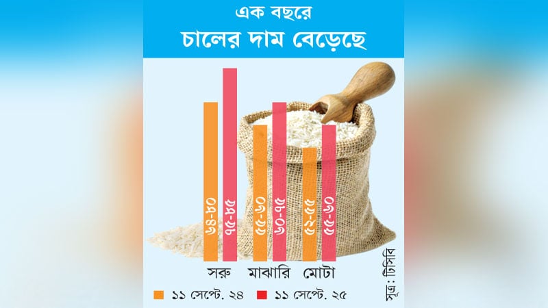 টিসিবির ওয়েবসাইট সূত্রে জানা গেছে, এক বছরের ব্যবধানে সরু চাল (মিনিকেট ও নাজিরশাইল)  ১১ দশমিক ১১ শতাংশ, মাঝারি চাল (বিআর-২৮ ও পাইজাম) ১৭ দশমিক ৩৯ শতাংশ এবং মোটা চালের (গুটিস্বর্ণা ও চায়না ইরি) ৭ দশমিক ৪৮ শতাংশ দর বেড়েছে।