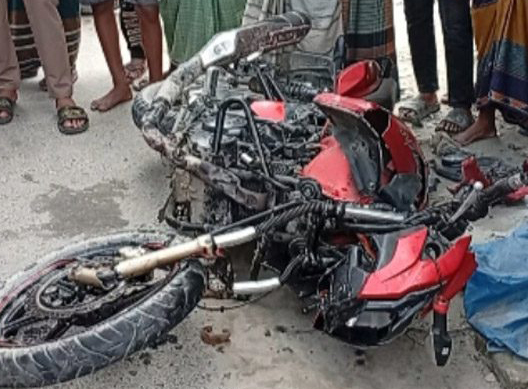 এ সংঘর্ষে মোটর সাইকেলটি ছিন্নভিন্ন হয়ে যায় এবং মোটরসাইকেলে
