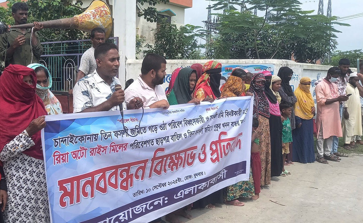 সিরাজগঞ্জে সরকারি নিয়ম উপক্ষো করে কৃষি জমিতে রিয়া অটো রাইচ মিল ও পুকুর খনন বন্ধের দাবিতে মানববন্ধন করেছে ভুক্তভোগী এলাকাবাসী। বুধবার সকালে রায়গঞ্জ উপজেলার চান্দাইকোনা ইউনিয়ন পরিষদের সামনে এ মানববন্ধন অনুষ্ঠিত হয়। এ সময় আইনশৃঙ্খলা রক্ষার্থে পুলিশ ও র্যাব ১২ এর সদস্যরা উপস্থিত ছিলেন। মানববন্ধনে ভুক্তভোগী কৃষক এস এম সোহাগ হোসেন বলেন, উক্ত অটো রাইস মিল বন্ধ না হলে অটোমিলের বিষাক্ত কালো ধোঁয়ার কারণে এলাকার পরিবেশ বিনষ্ট হবে এবং মানুষের বসবাসের অযোগ্য হয়ে পড়তে পারে। স্থানীয় কতিপয় প্রভাবশালীদের ছত্রছায়ায় এ উপজেলার চান্দাইকোনা মৌজায় তিন ফসলি জমিতে গড়ে উঠে বিসমিল্লাহ অটো রাইস মিল। এ মিলের নির্মাণ কাজ বন্ধের জন্য সরকারের বিভিন্ন দপ্তরে অভিযোগও দাখিল করা হয়েছিলো। কিন্তু সংশ্লিষ্ট প্রশাসনের যোগসাজশে নাম পরিবর্তন করে রিয়া অটো রাইস মিলকে পরিবেশ ছাড়পত্র ও তিন ফসলী জমিতে পুকুর খননের অনুমতি দেয়া হয়। তিন ফসলী জমিতে গড়ে ওঠা পরিবেশ বিধ্বংসকারী প্রতিষ্ঠানের পরিবেশ ছাড়পত্র বাতিল ও ফসলী জমিতে পুকুর খনন বন্ধ করতে হবে। মানববন্ধনে আরো বক্তব্য রাখেন, স্থানীয় বিএনপি নেতা রুবেল সরকার, আব্দুল মান্নান, মোমিন মিয়া, বাবু সেখ, আবু ওয়াজেদ সরকার প্রমুখ। এ মানববন্ধনে ভুক্তভোগী কৃষক ও নারী পুরুষ অংশ গ্রহণ করেন। ইতিপূর্বে ওই মিলের বিরুদ্ধে বিষাক্ত পানি, বর্জ্য, ছাই ও কালো ধোয়ায় ফসল ও পরিবেশ নষ্টের হাত থেকে রক্ষার অভিযোগ আনা হয়। এ অভিযোগে রিয়া অটো রাইস মিল কর্তৃপক্ষের বিরুদ্ধে পরিবেশ অধিদপ্তরের পরিবেশ ভবন আগারগাঁও এ পরিবেশ অধিদপ্তরের যুগ্ন সচিব ও মনিটরিং এন্ড এনফোর্সমেন্ট শাখার পরিচালক বিভাগ ওই এলাকার কৃষকের ফসলের ক্ষতির অভিযোগে এক লাখ টাকা ক্ষতিপূরণ আদায় করা হয়।