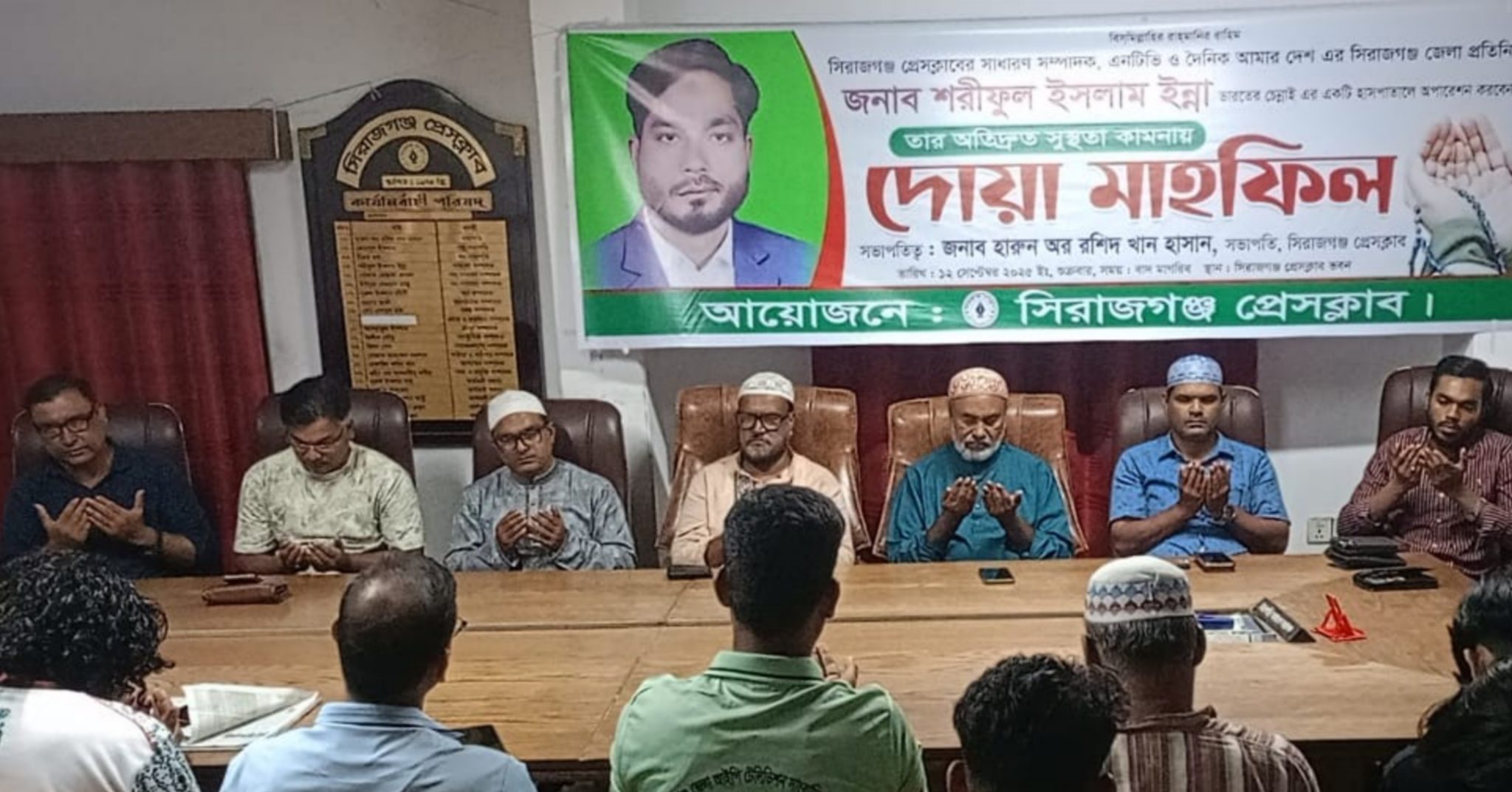 শুক্রবার ( ১২ সেপ্টেম্বর ২০২৫) বাদ মাগরিব সিরাজগঞ্জ প্রেসক্লাবের আয়োজনে দোয়া মাহফিলে সভাপতিত্ব করেন সিরাজগঞ্জ প্রেসক্লাবের সভাপতি মোঃ হারুন অর রশিদ খান হাসান। সঞ্চালনা করেন সিরাজগঞ্জ প্রেসক্লাবের দপ্তর সম্পাদক শেখ মোঃ এনামুল হক।